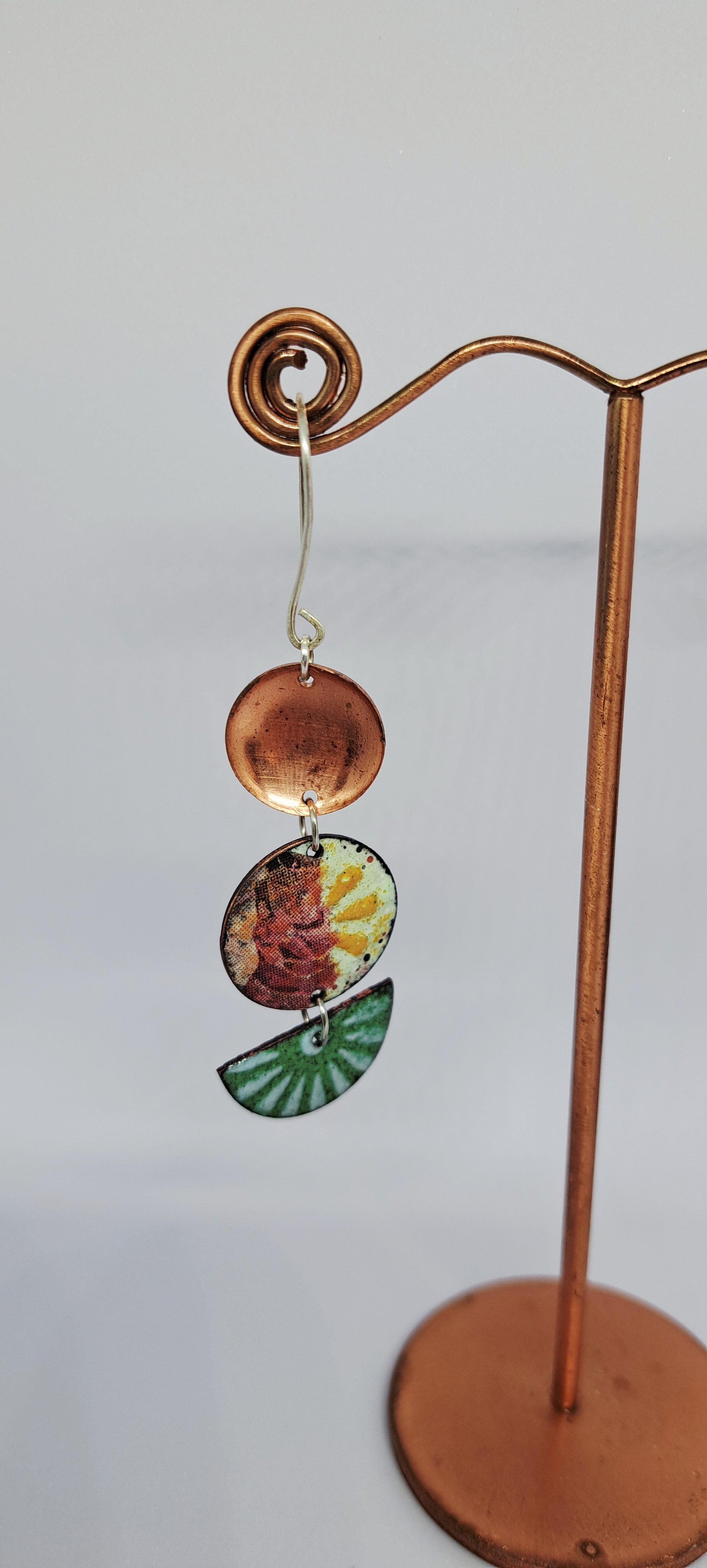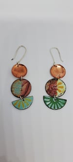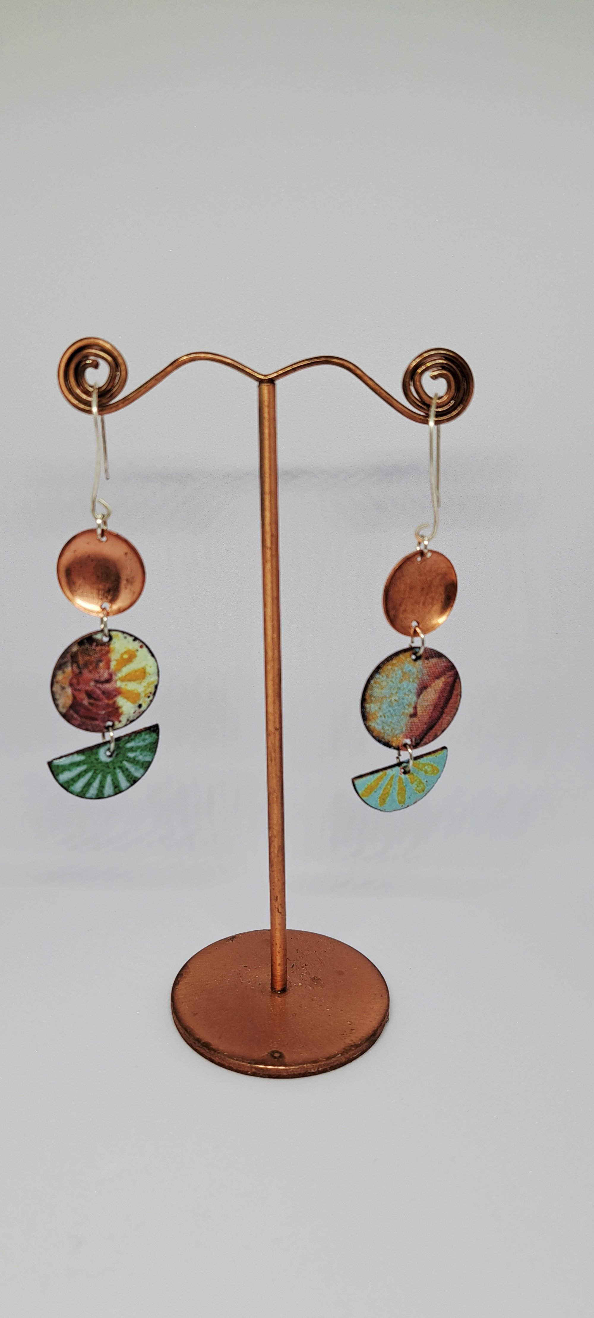 These beautiful long drop earrings are made with hand cut copper sheet with enamel and decoupage and a silver earwire. Completely unique one off pieces.