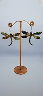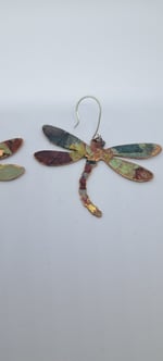 These copper earrings are layered with paper and gold leaf and finished with a clear varnish. Silver earwires for sensitive ears.