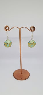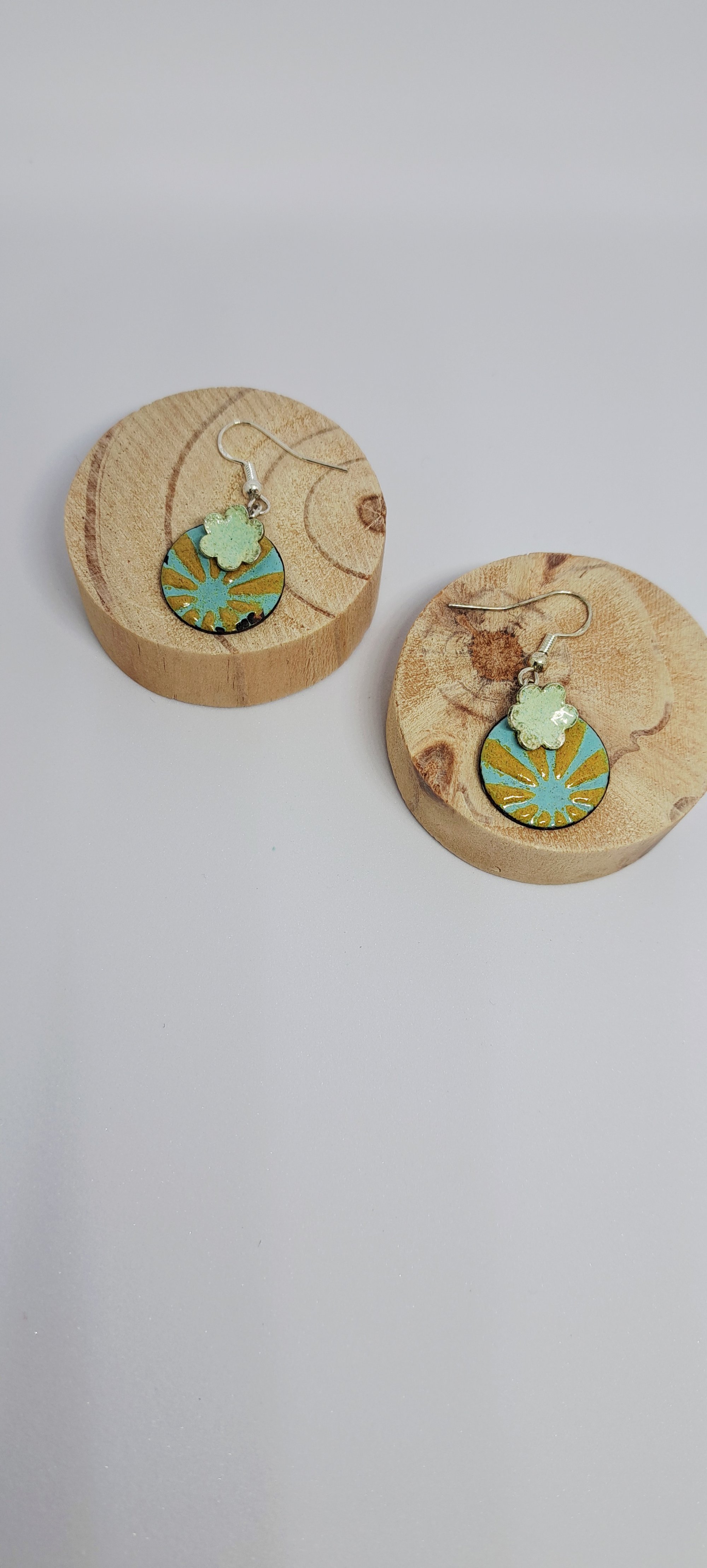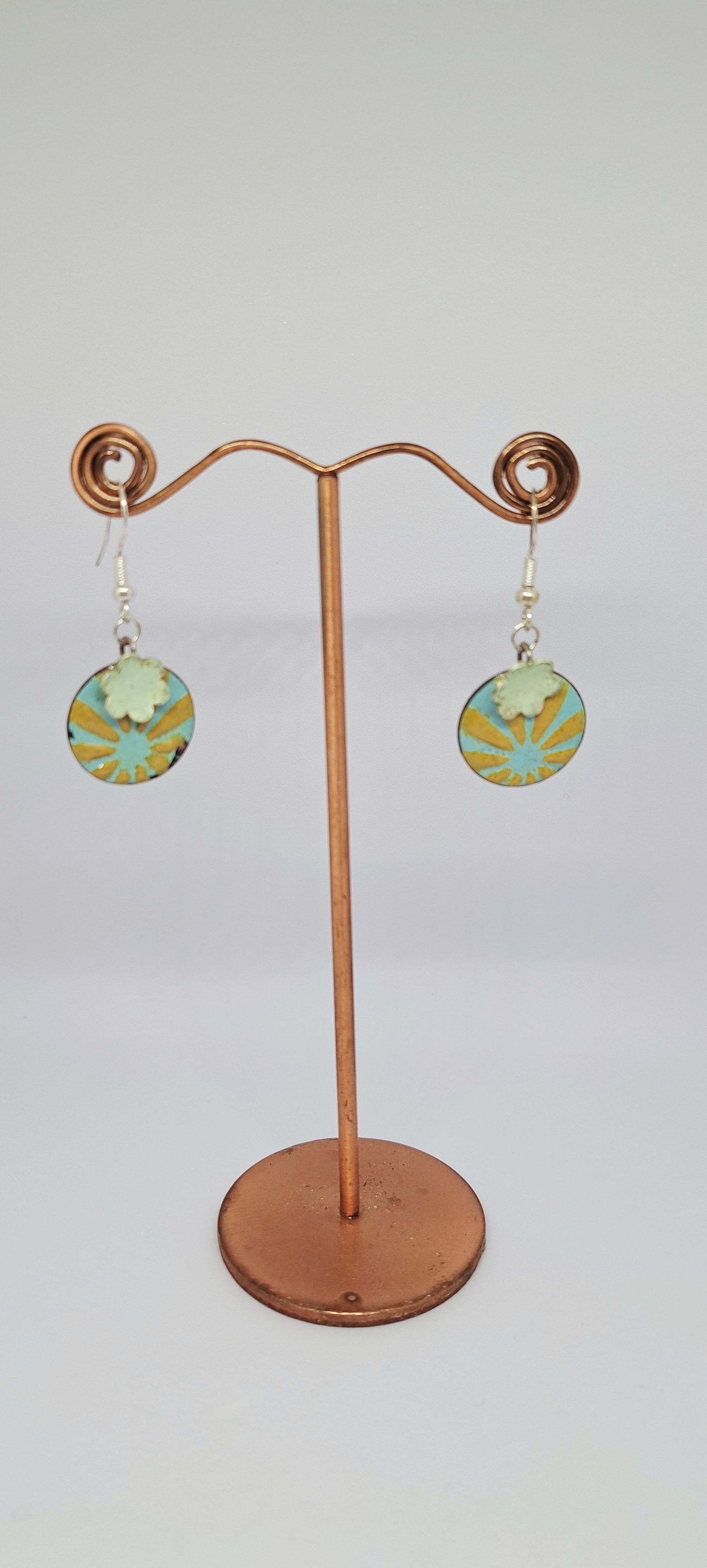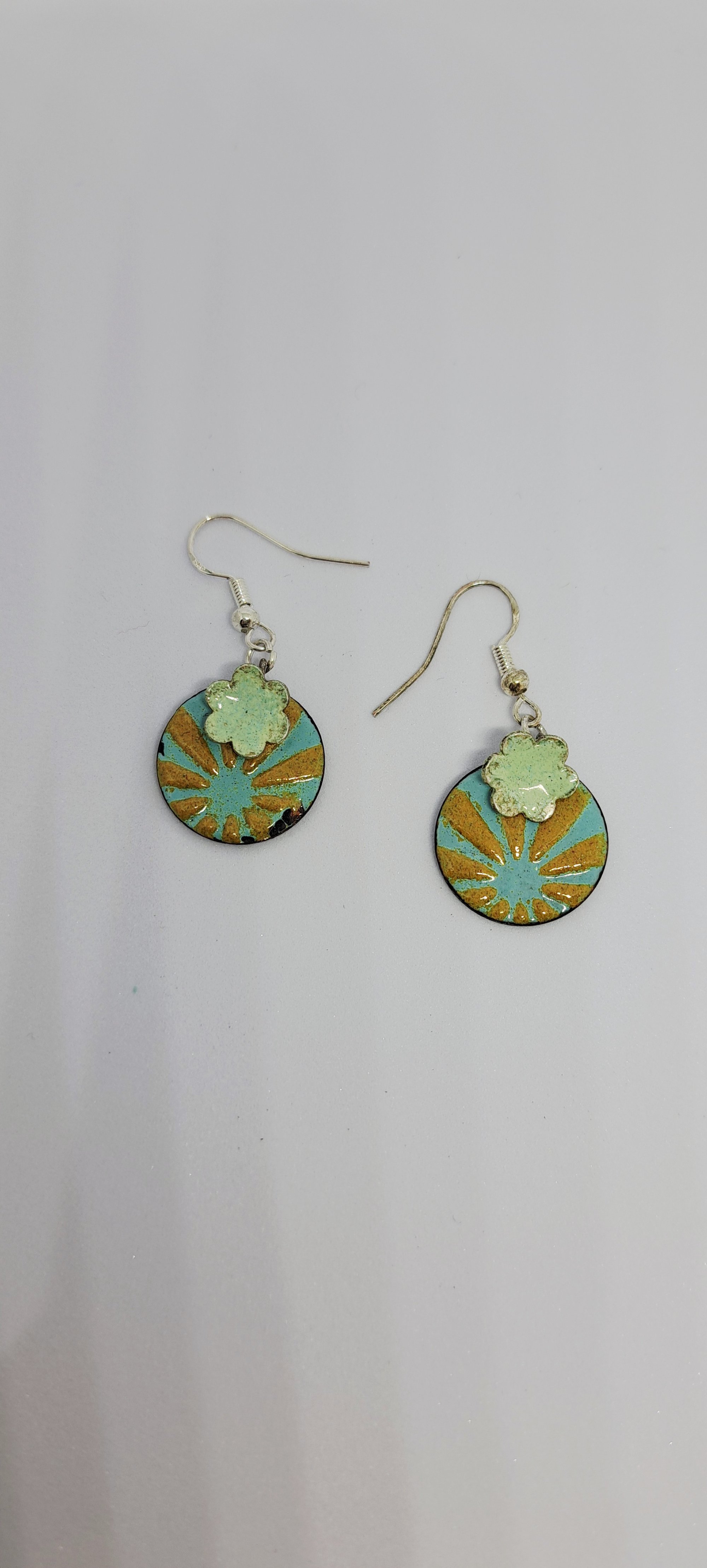 Enamel on copper with a solid silver flower. All my work is unique one of a kind pieces. The earwires are silver so kind on ears.