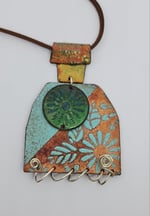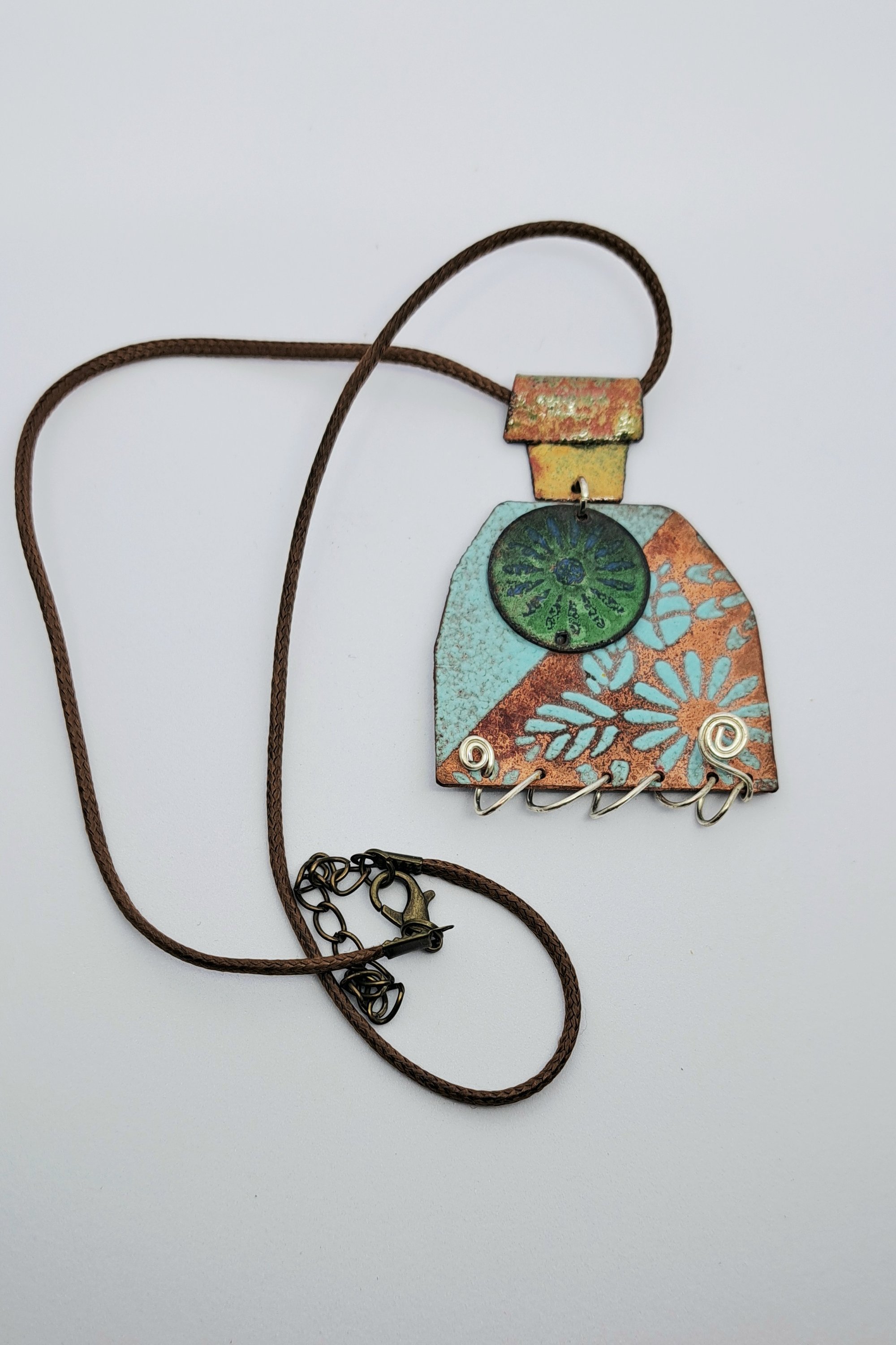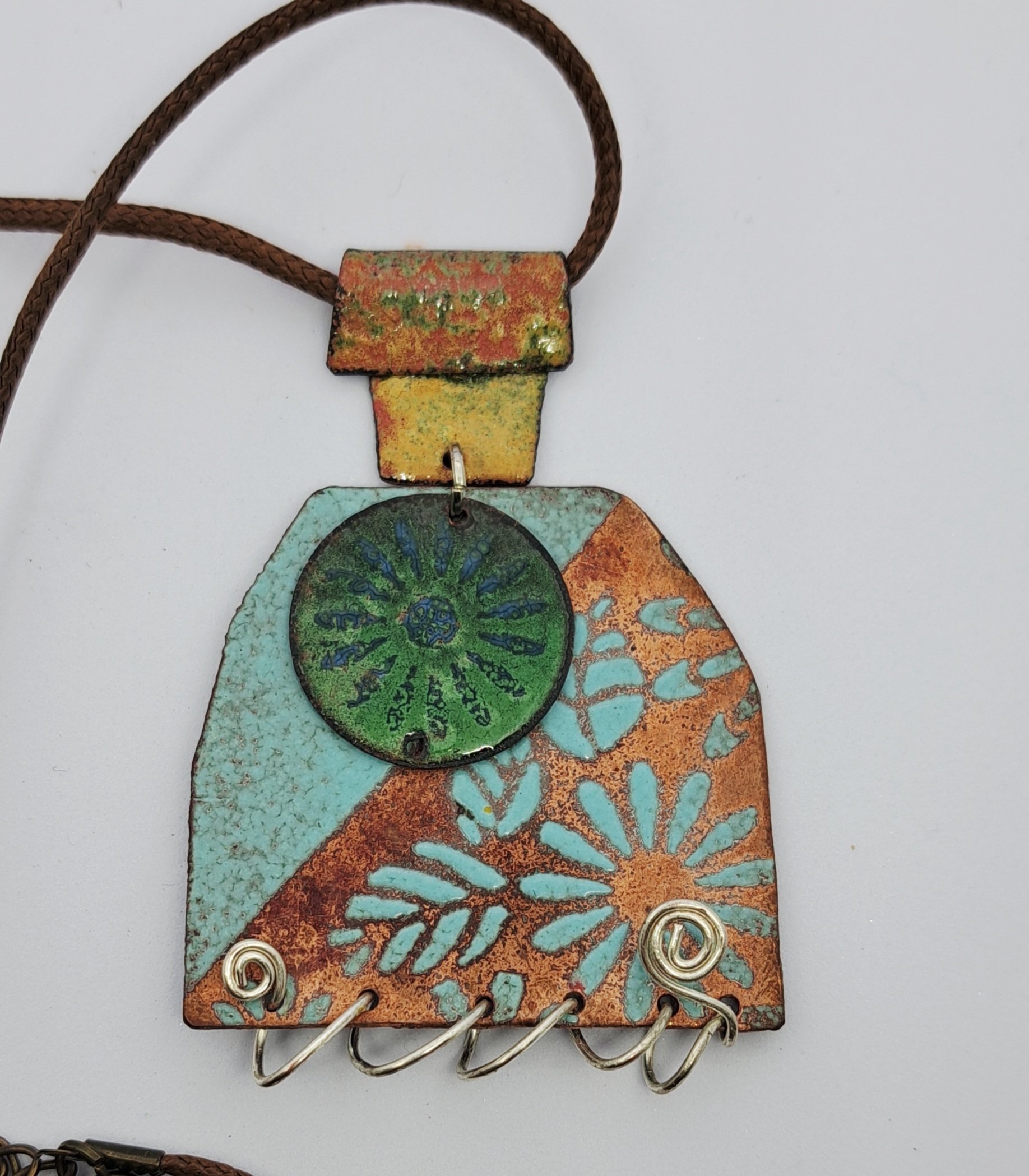 Lovely pendant enamel on hand cut copper. Great movement. Adjustable cord.