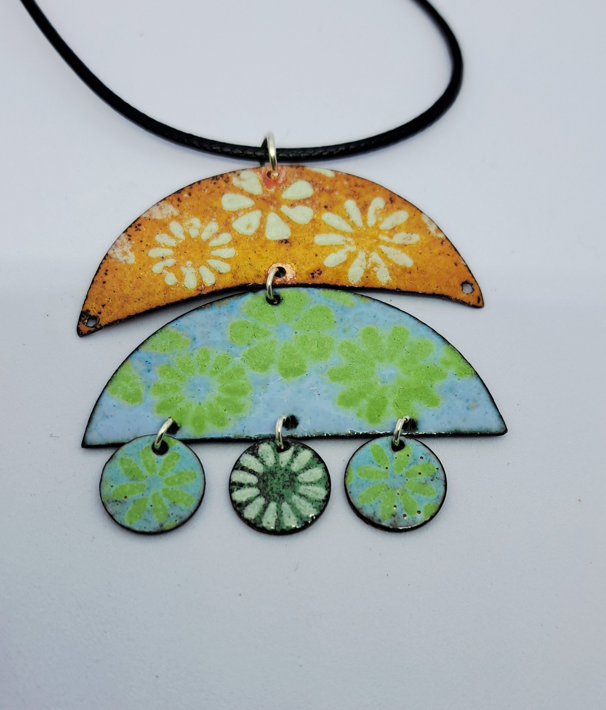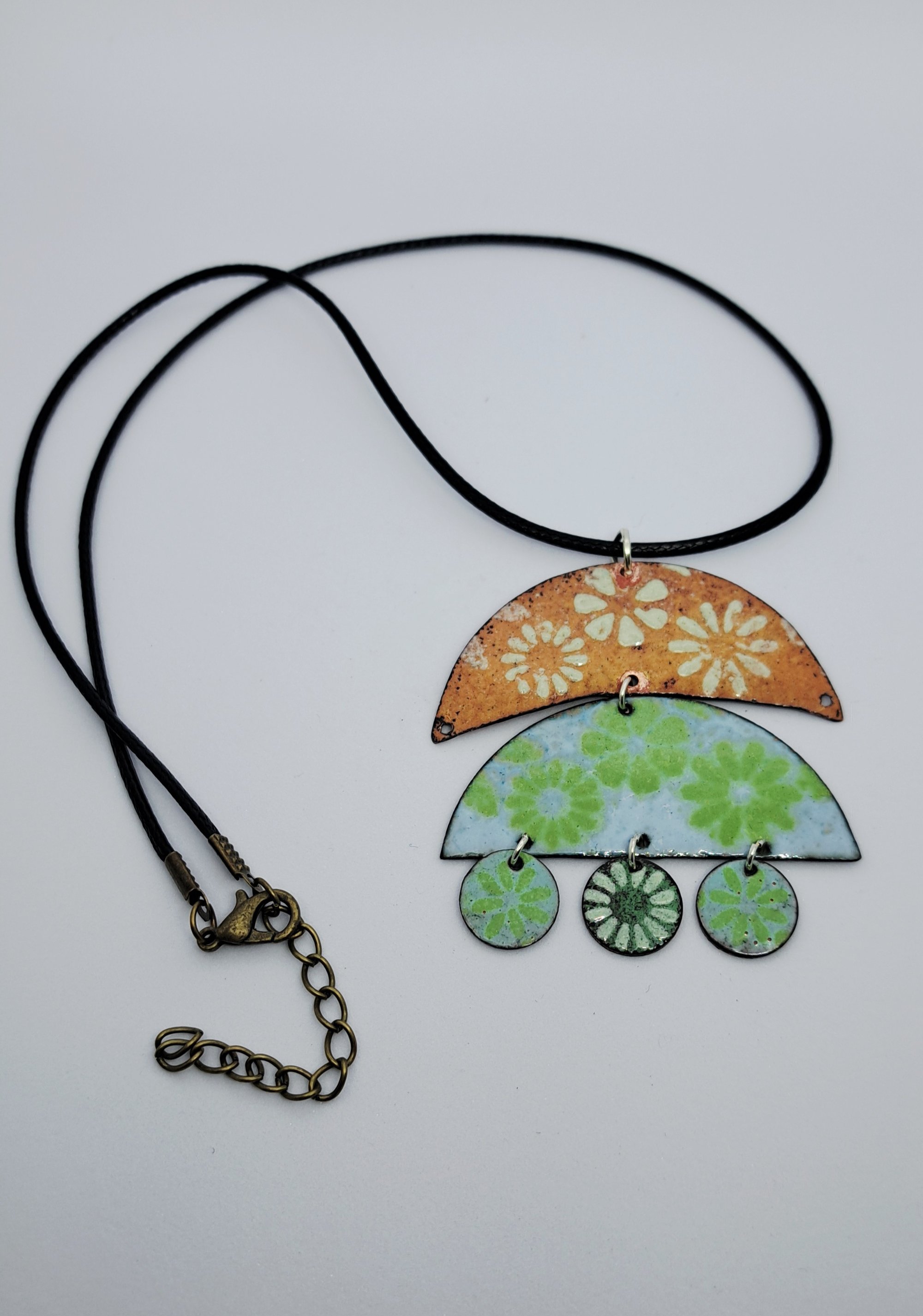 This fun pendant is hand cut copper sheet with kiln fired enamel. Ajustable neck cord.