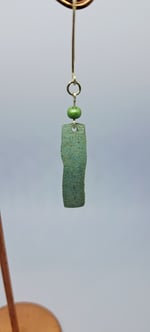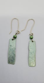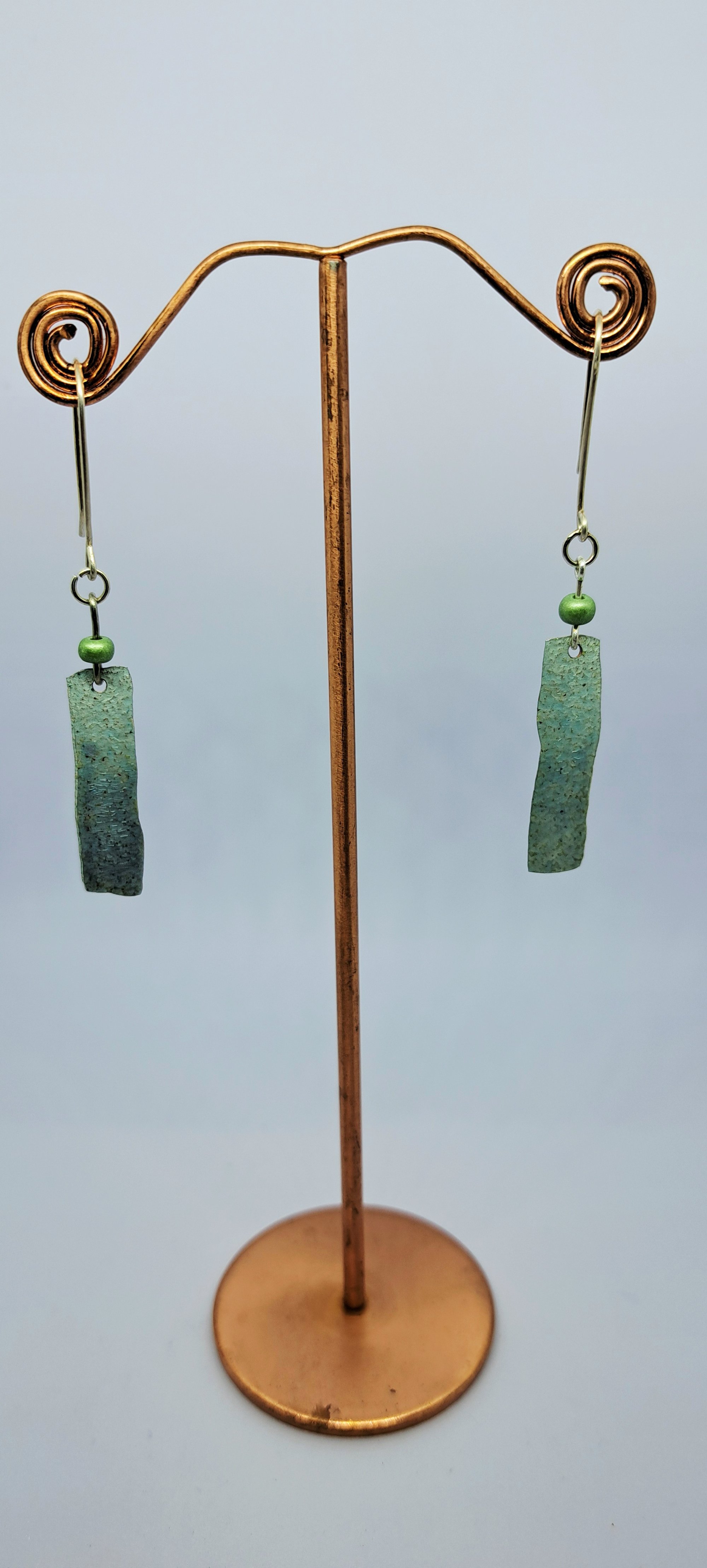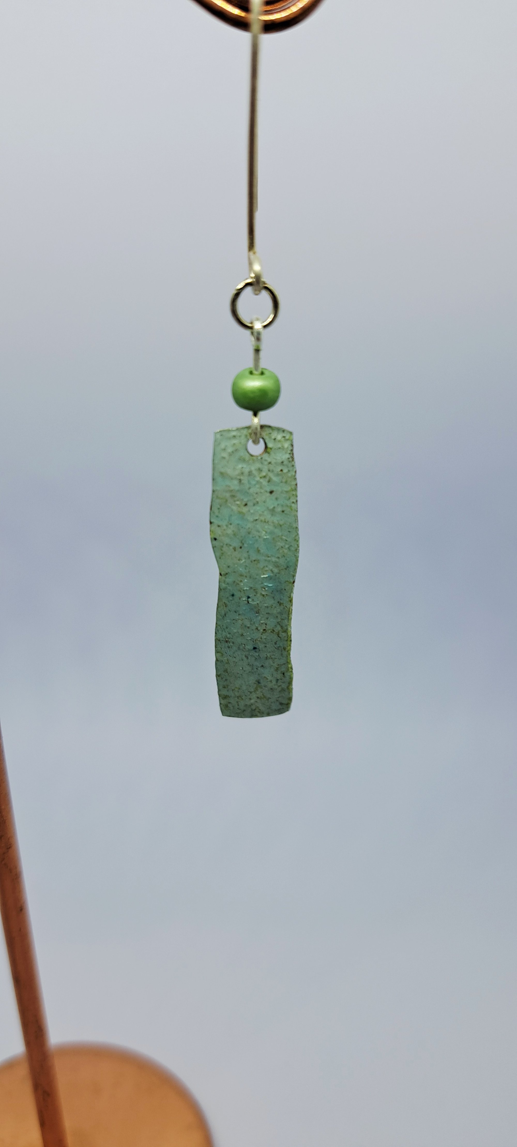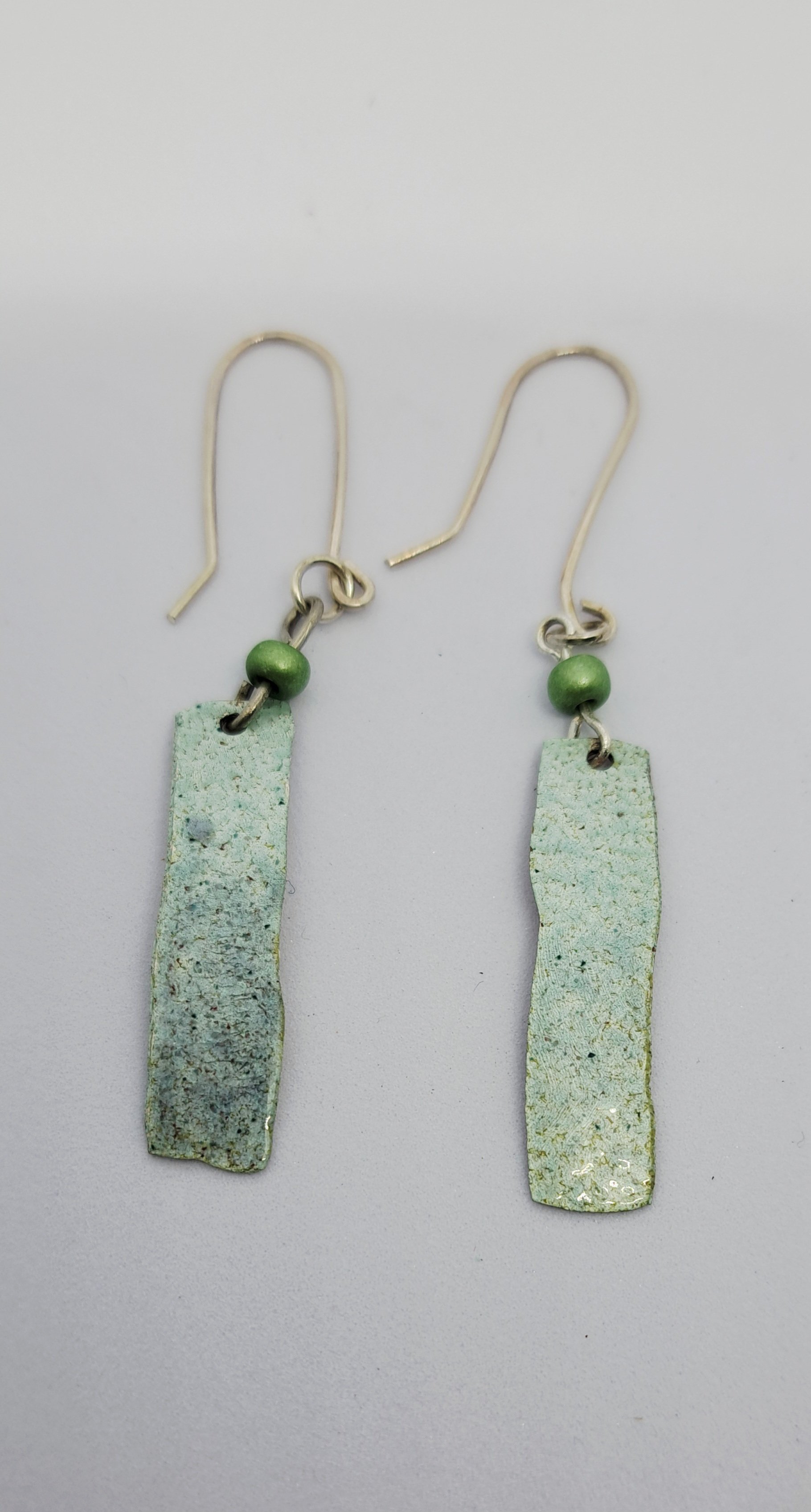 Solid silver hand cut sheet with a green iridescent enamel fired in my Kiln. With green bead to set it off nicely to make the colour pop. Silver earwires for sensitive ears.